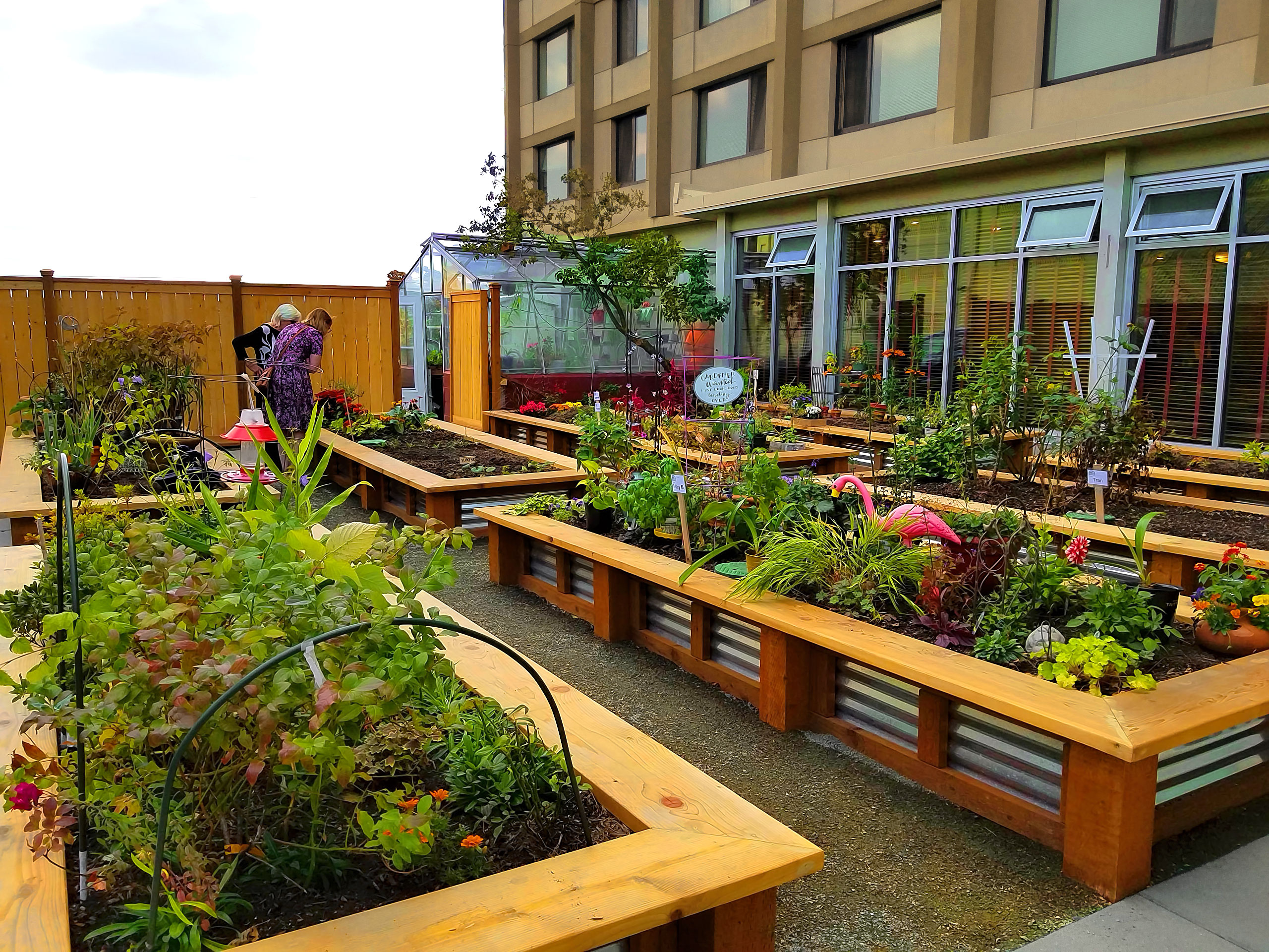 Our residents feel so fortunate to have a p-patch all their own right out the back door in their in-city retirement home. Some of our residents are long-time gardeners, bringing their skills to enhance their spot and some are novices that are "digging in the dirt" for the first time. For all gardeners, they are growing vegetables, herbs for our community kitchen or beautiful flowers for all to enjoy. All of us feel that this experience not only beautifies our space, but improves physical and mental well-being of the gardeners and the rest of the community as well.